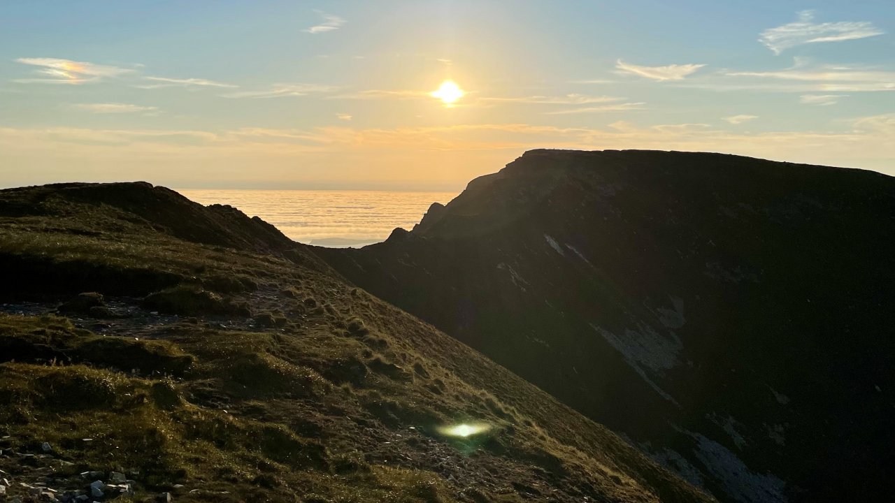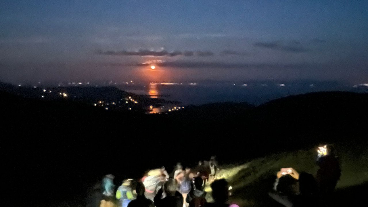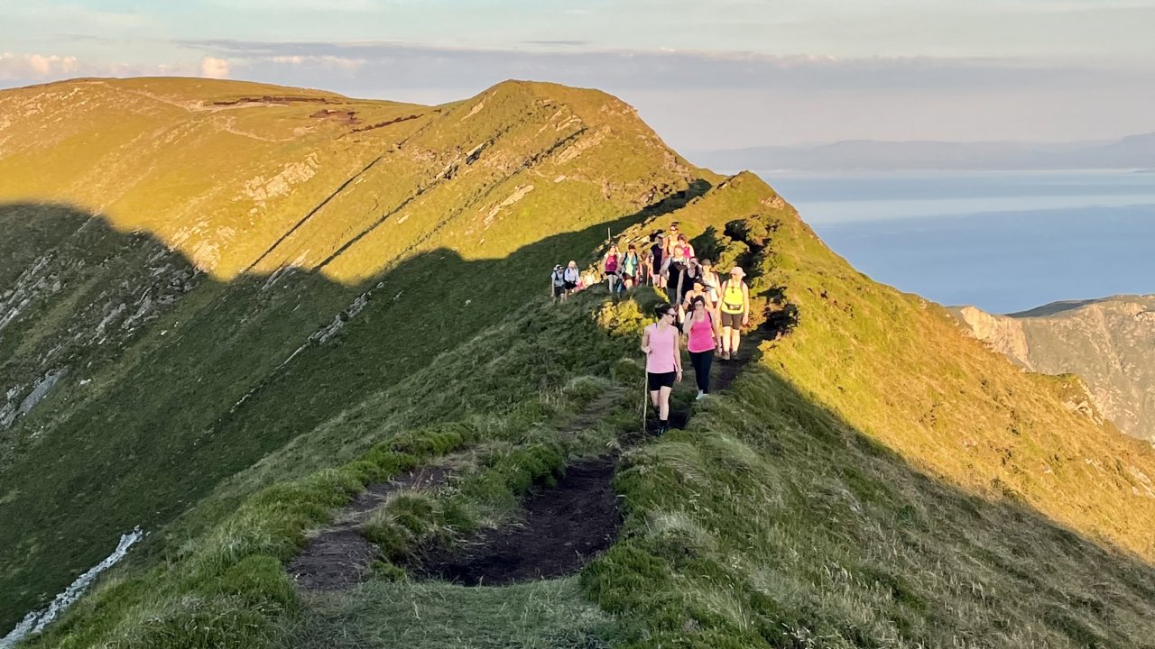 We will climb the mountain via the Pilgrims Path which leads us onto the South Summit and our first big view of the cliffs, we track the cliff onwards from here towards the main summit making out way over the breathtaking but safe ‘One Mans Pass’ along our way. To keep us on the safer side of life we will return across the Pass before sunset and watch the spectacle from the south summit. The full Moon will be rising in the northeast as the sun sets and our decent route off the mountain will see us walking towards it, lighting the waters of Donegal bay as it rises higher into the night sky.